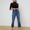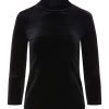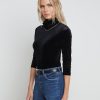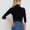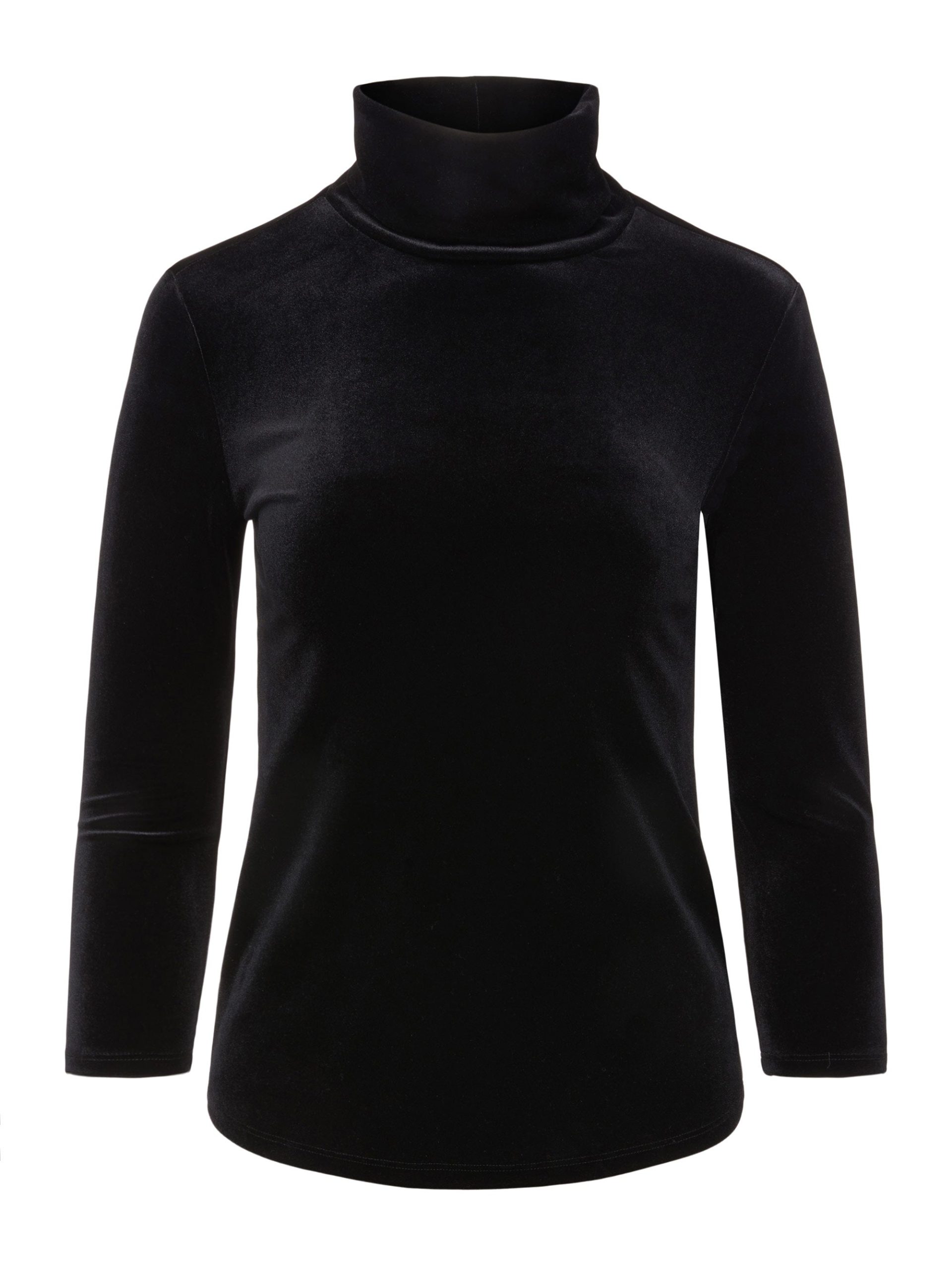 An essential, slim-fit turtleneck top in plush velvet stretch denim and classic black hue. High-stretch fabric has a supple feel and superior recovery that creates a smooth, flattering silhouette. Style finished with a three-quarter length sleeve.