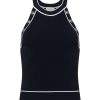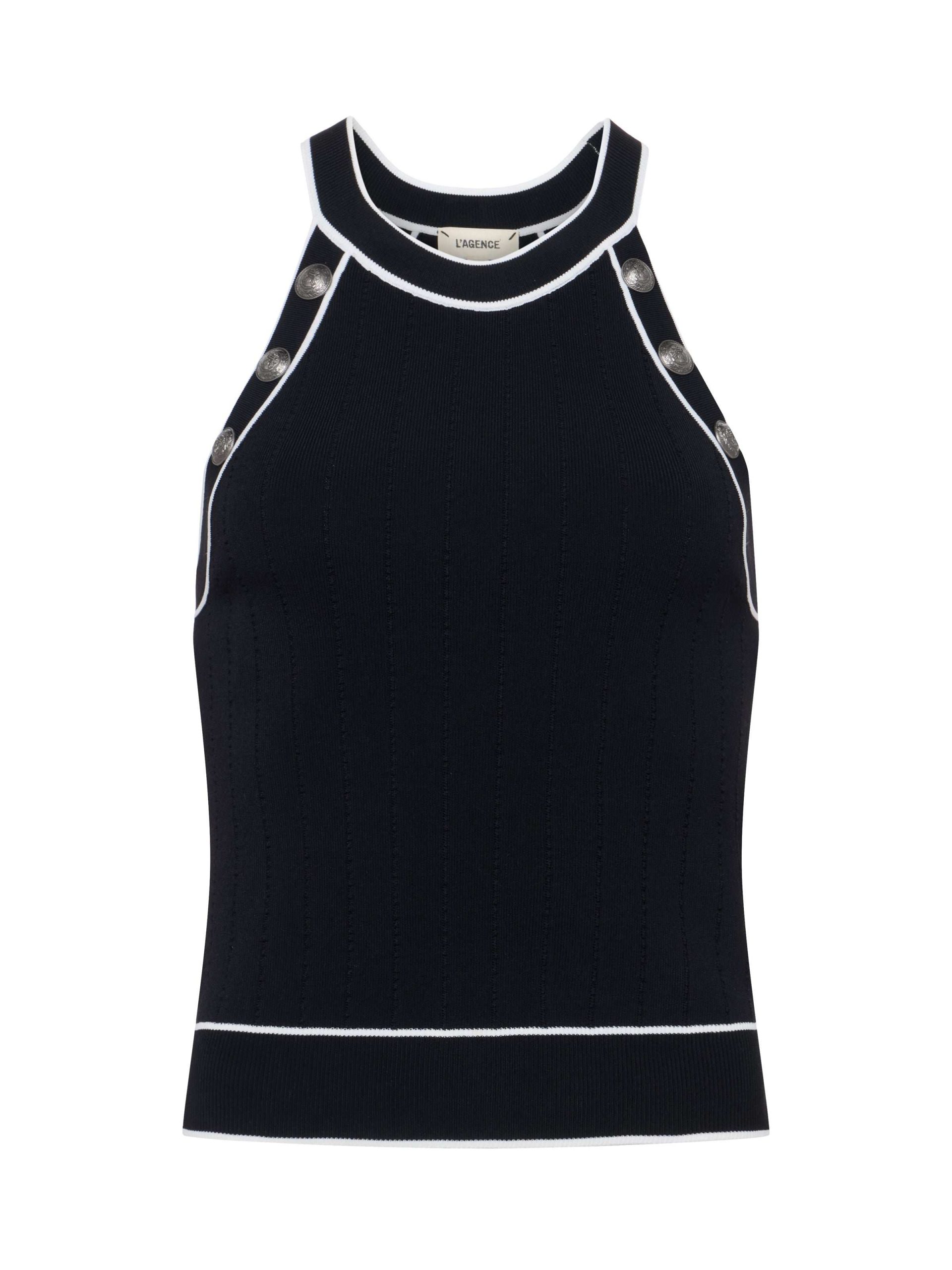 The Rosemary is a stretch knit tank, featuring a sporty high neckline, contrast trims, and silver hardware that adds just the right amount of edge.• Power knit• Pullover style• Decorative embossed dome buttons